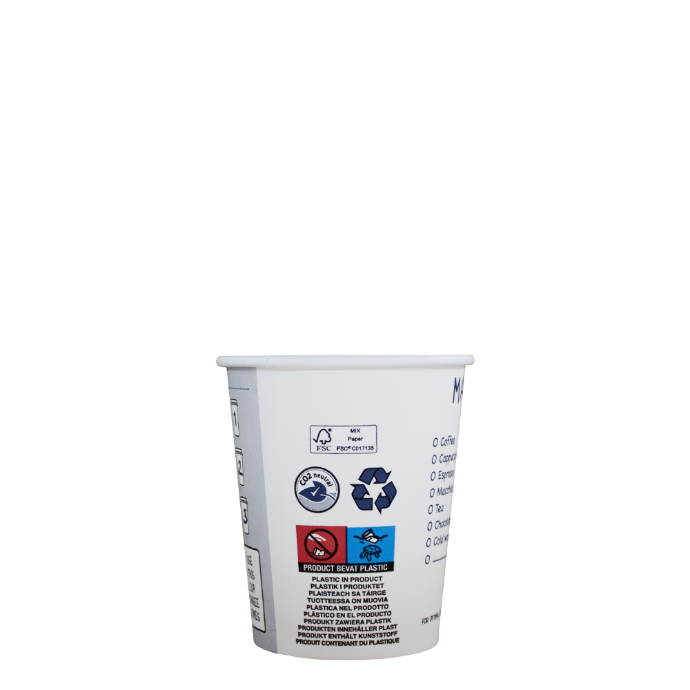 Met een royale inhoud van 230 ml biedt deze koffiebeker voldoende ruimte om te genieten van je favoriete warme drank. Bovendien prijkt op elke beker een meertalige SUP-markering, waardoor ze voldoen aan de normen van diverse EU-landen. Of je nu een internationaal bedrijf runt of lokaal actief bent, deze cups passen naadloos in elke setting.