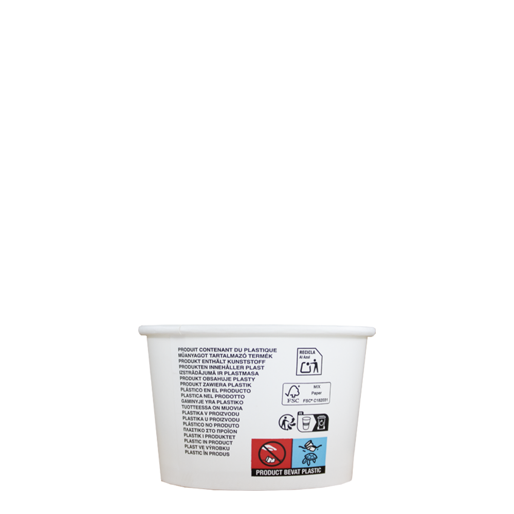 Dompel jezelf onder in de wereld van genot met onze witte stevige kartonnen ijsbekers, perfect geschikt voor alle varianten van verse softijs en schepijs. Gemaakt van hoogwaardig FSC-gecertificeerd karton, zijn deze 8 oz ijsbekers niet alleen een milieubewuste keuze, maar ook een ideale ruimte voor 3 heerlijke bolletjes ijs. Volledig naar jouw smaak aangekleed met slagroom, toppings of andere verrukkelijke toevoegingen.