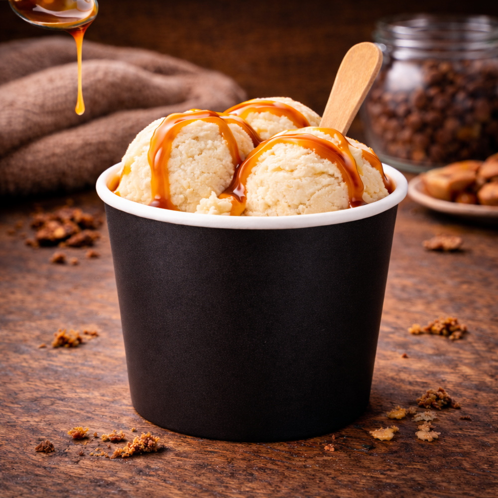 Stap binnen in een wereld van verfijnde smaak en elegantie met onze zwarte stevige kartonnen ijsbekers, ontworpen voor de perfecte presentatie van verse softijs en schepijscreaties. Deze royale 12 oz ijsbekers bieden niet alleen een solide basis voor 5 verrukkelijke bolletjes ijs, maar tillen ook jouw ijservaring naar ongekende hoogten. Of je nu de voorkeur geeft aan een klassieke smaakcombinatie, je favoriete ijssmaken mengt met slagroom of je laat inspireren door een veelheid aan heerlijke toppings, deze ijsbekers vormen het ideale podium voor al jouw culinaire ijsexperimenten.