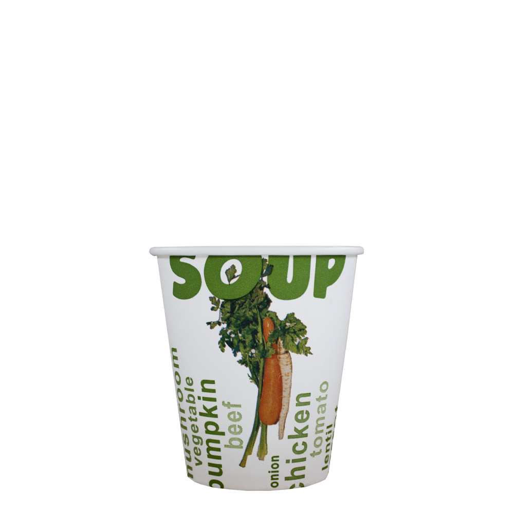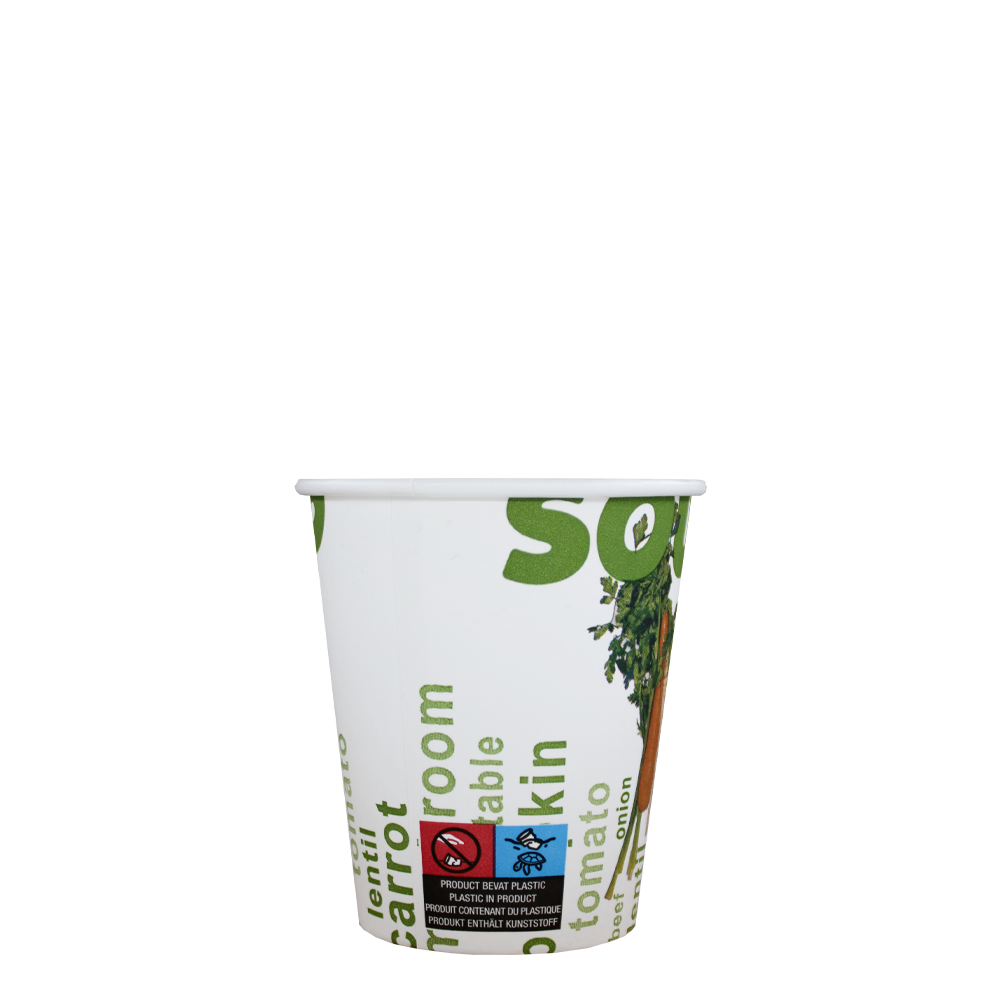 Onze kartonnen soepbekers zijn een uitstekende vervanger voor de duurdere Cup-a-Soup bekers. Hetzelfde formaat voor een fractie van de prijs. En je kan ook allerlei andere soepjes in deze bekers serveren. We hebben deze kartonnen beker uitgevoerd met een extra zwaar karton, hierdoor zijn de bekers zeer geschikt voor extra hete kokende soep. De kartonnen soepbeker heeft een leuk en gezond design. Ook de prijs is gunstig, ruim de helft van de cup a soup bekers! Het formaat van 300cc is een geschikte beker voor een grotere beker soep.